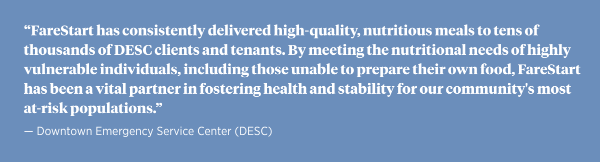 Nearly every day, 1,500 fresh, nutritious meals prepared by FareStart students, staff and volunteers make their way to Seattle-area nonprofits, shelters, respite centers, youth and adult daycare centers and schools. The breakfasts, lunches, dinners and snacks produced through our Community & School Meals program have played a central role in our work for more than 30 years — and on multiple levels.