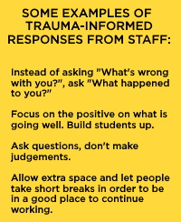 With this framework, our staff strives to maintain an environment of healing and recovery and to avoid practices and services that may inadvertently re-traumatize.
