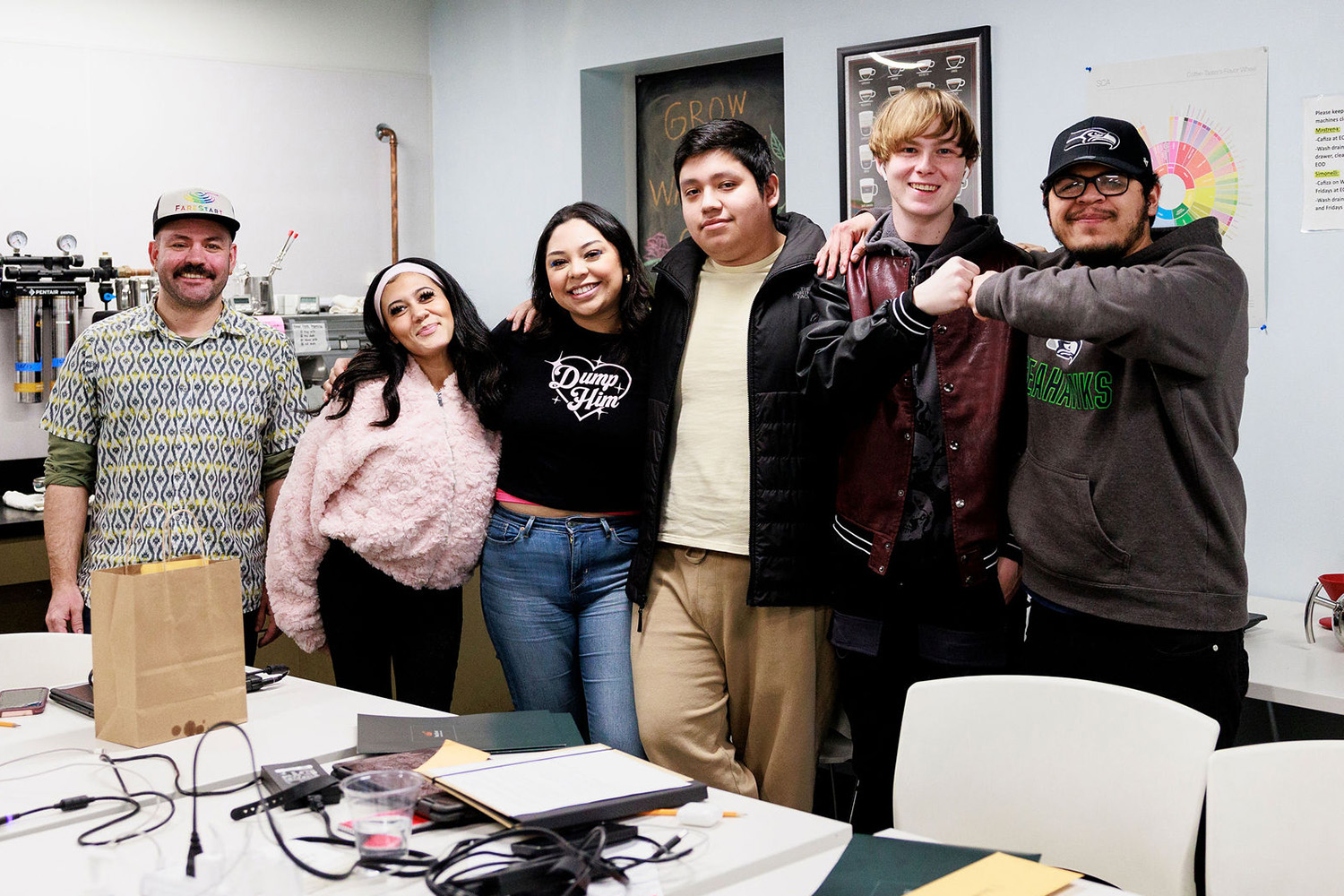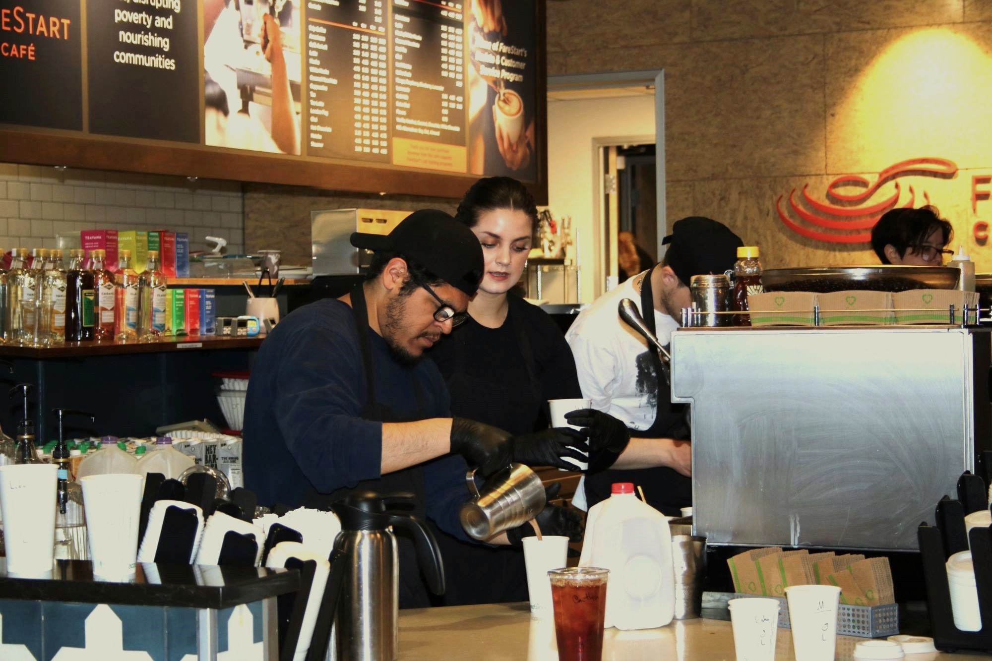 The pressure was on at the FareStart Café in South Lake Union, with a line of customers waiting for their drinks. But Eli (he/him) and Payton (he/him), two students in FareStart’s Barista & Customer Service Program, were having fun and rising to the occasion. Working alongside FareStart barista trainer Nikole Taber (she/her) and several other staff members, they calmly made their way through the orders and took pride in their work, celebrating their latte art and delivering drinks with a smile.